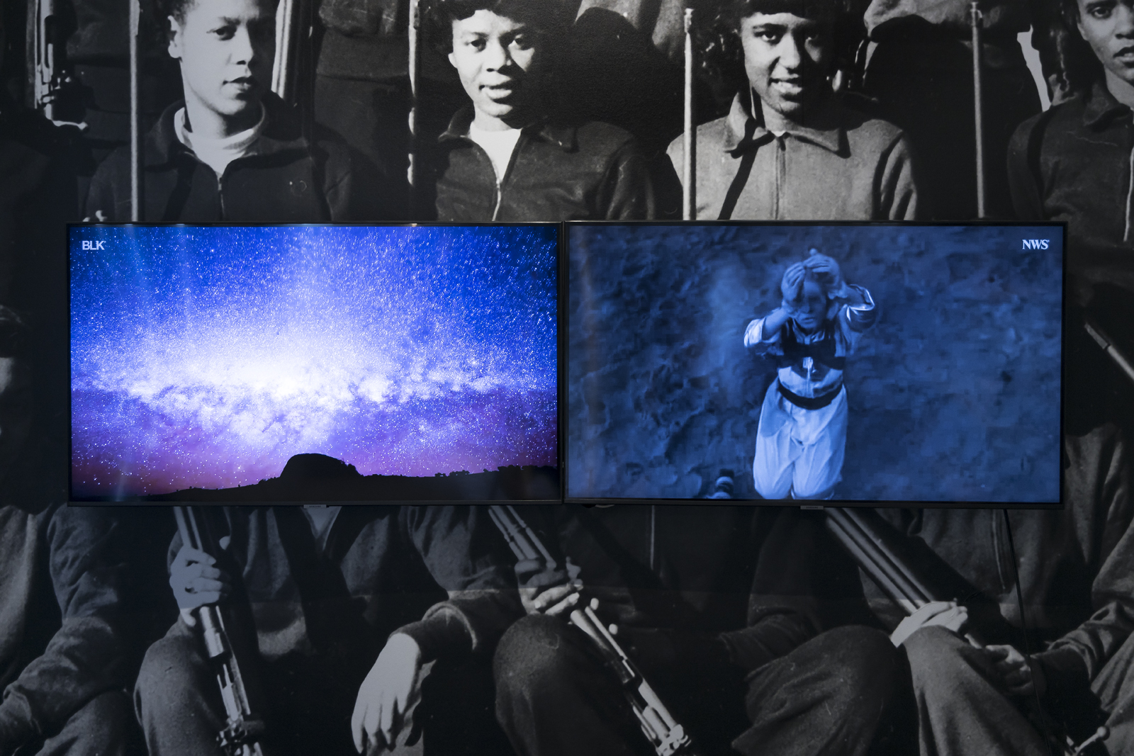 Exploring film as a powerful collective experience that can be manipulated through its essential visual and audio components, BLKNWS® reflects upon the contemporary period utilizing fragments of popular culture, archival material, and filmed news desk segments. Historical iconography sits side by side with ordinary images from our daily lives. When examined through Joseph’s lens, these images are steeped with an unusual perception of contemporary society that doubles as the artist’s ethos, inheriting a new life of reflection and signification. The dichotomy constructed by the device of the split screen polarizes the images employed, fragmenting the narrative and formalizing the images for their poetic and political potential. The ways in which the newscast is combined and collaged becomes as surreal as our current cultural condition.