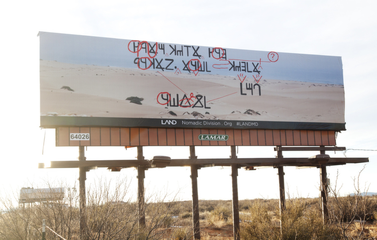 Daniel R. Small’s billboards throughout the Las Cruces, NM area for The Manifest Destiny Billboard Project, entitled Pending Cipher for the Open Present, were constructed by culling materials from two faux-historical sites: the Los Lunas Decalogue Stone near Los Lunas, NM, and Cecil B. DeMille’s film set for The Ten Commandments in Guadalupe, CA. The ten billboards depicted text from the Decalogue Stone, believed by many as an attempt at writing the Ten Commandments, in a language derived from Cypriot Greek and ancient Hebrew. Small added modern day proofreading marks to this pseudo-language, creating illusory hieroglyphs superimposed on images taken by the artist in Guadalupe, CA where DeMille demolished and buried the ersatz Egyptian city set used in The Ten Commandments film from 1923.