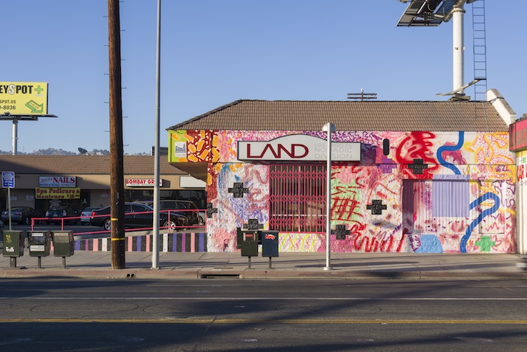 hey babe take a walk on the wild side, Sarah Cain‘s site-specific painting on the exterior of LAND HQ, responds directly to the lively intersection of Santa Monica Boulevard and Highland Avenue, engaging with the architectural features and varying material qualities of the strip mall wall. The layered and dimensional painting expands beyond the wall surface and onto the security gates and railings, encompassing LAND’s office space and enlivening the previously mundane utilitarian features. Facing south on Santa Monica Boulevard, Cain’s sprayed and splashed abstracted forms and vibrant colors found in surrounding signage lyrically move along the building’s surfaces, visually conveying the work’s title from Lou Reed’s infamous song, “Walk on the Wild Side” from 1972.