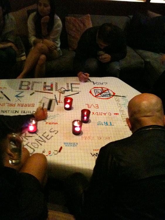 Lisa Anne Auerbach invited guests to “pattern their enemies,” a collective effort to create the pattern for a knitted blanket inscribing the names of personal adversaries within. A nod to Madame Defarge, the villain in Charles Dickens’ A Tale of Two Cities that relentlessly knits the names of those to be executed in the French Revolution, Auerbach sees the process of transforming language into fabric as one of a strengthening of resolve, a battle cry, a means to harbor a host of metaphysical “bad energy,” and, perhaps on that specific day, an action in parallel to the inscription of the “righteous” in the “book of life.”