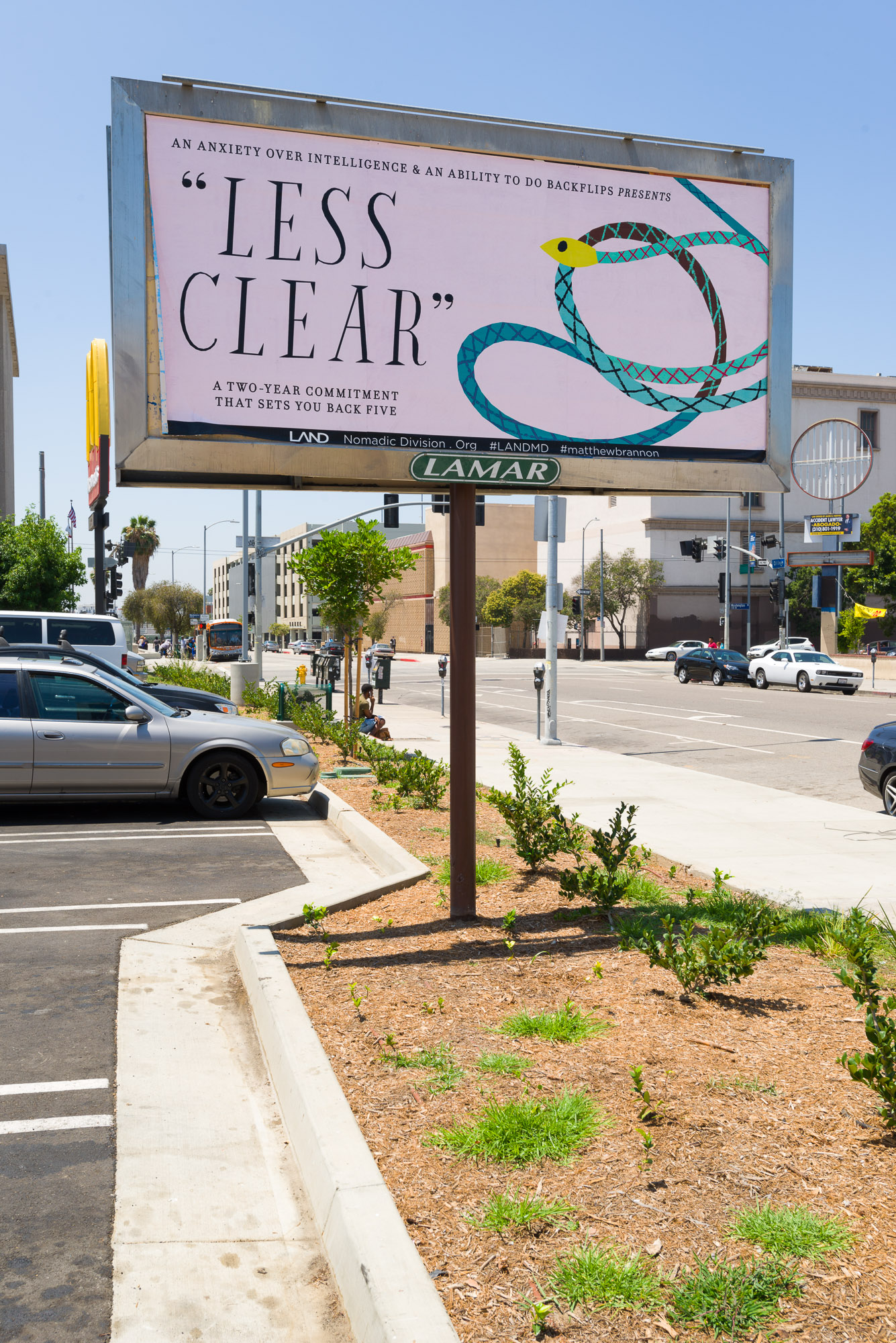 As the final chapter of the two-year cross-country journey westward, Brannon’s billboards played on the disillusionment of hopes and dreams associated with heading west, particularly to Los Angeles. In reality, the fantasy of this city becomes ever more opaque and intangible.