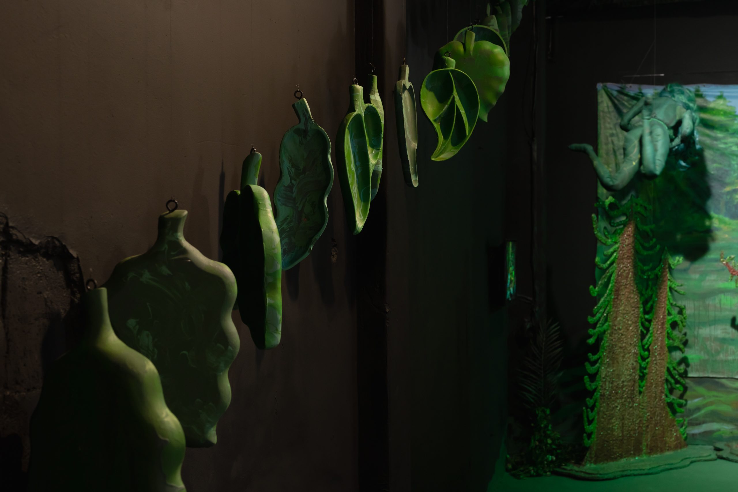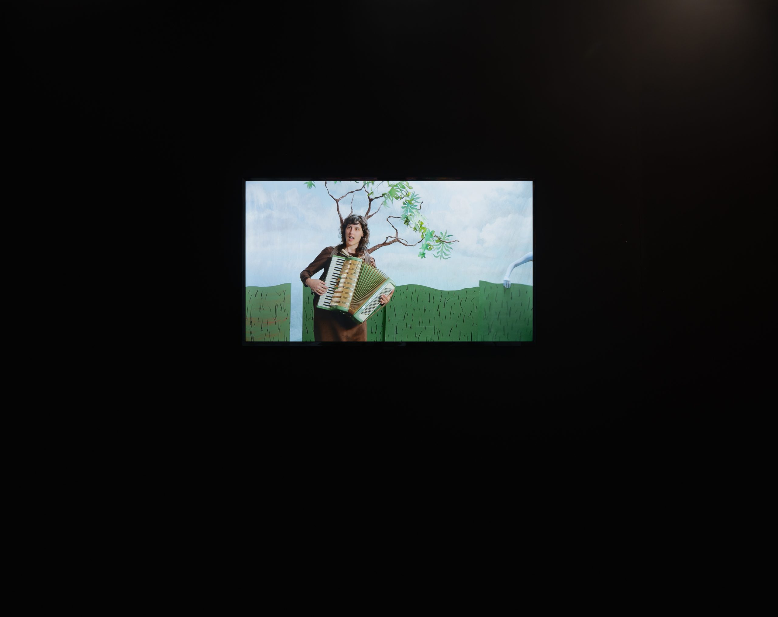 The installation presents a variety of techniques and mediums, including CGI, claymation puppetry, green screen, found nature footage, live action, painted dimensional sets, costumes, makeup, and newly composed music alongside a choir. Hall’s allegorical worlds offer a space to loosen up and enjoy the contradictions of sexuality, pleasure, and morality.