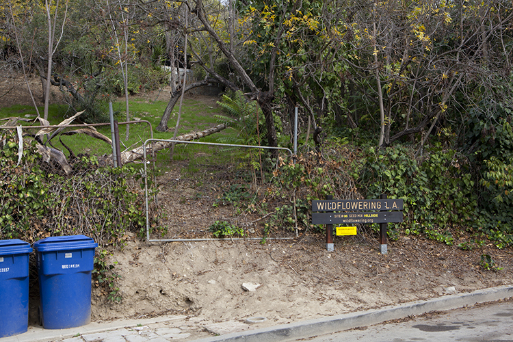 Wildflowering L.A. brought a wild and beautiful seasonal native landscape to open plots of land throughout Los Angeles County. 50 sites were selected from an open call based on public visibility and distribution across the county. Owners of selected sites were given free native wildflower seed mixes at workshops in partnership with The Theodore Payne Foundation for Wildflowers & Native Plants. Soil preparation, seeding, and wildflower tending were demonstrated and one of four custom wildflower seed mixes was prescribed – Coastal, Flatlands, Hillside, and Roadside – inspired by Reyner Banham’s 1971 book, Los Angeles: The Architecture of Four Ecologies. Each of the participating sites was officially identified with a prominent carved wood sign. The project culminated with an exhibition in spring 2014.