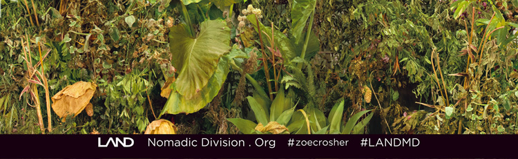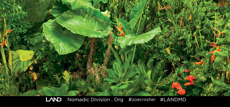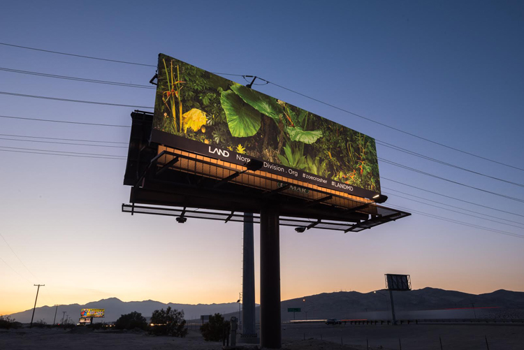 Zoe Crosher‘s chapter of The Manifest Destiny Billboard Project, entitled LA-LIKE: Shangri-LA’d, was created by staging a lush landscape in the former Communist Chinese Headquarters at Mandarin Plaza in Los Angeles’s Chinatown. The entropic installation was documented by Crosher onsite to track the gradually transforming and decaying façade of a landscape. Crosher collaborated with florist Hollyflora to create a wall of flora and fauna that embodies the fantasy of Los Angeles and the promise of the western ideal. As the billboards unfold over space and time traveling west along I-10 in the Palm Springs, CA area, the lush green foliage, symbolic of the promise of abundance/fecundity and in stark contrast to the barren desert landscape, becomes increasingly withered and brown. The falsity of the romanticized notion of Manifest Destiny is manifest in her billboards as the promise of riches slowly degrades and fades away, just as the intangible American Dream slips away from those in its pursuit.